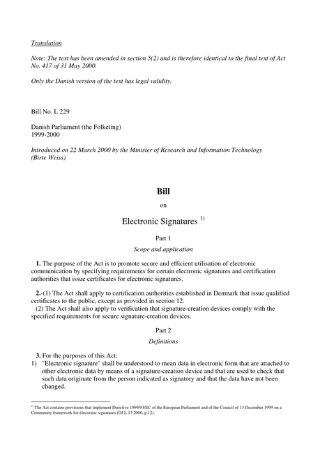 The law also provides rules for the certification authorities that issue digital certificates. It is limited to certification authorities established in Denmark and does not specify any special requirements concerning certification authorities and electronic signatures originating in other countries. However, it does make it possible for certificates issued by them to be recognized in the same way as certificates issued by Danish certification authorities.