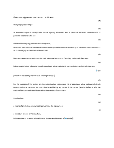 The U.K. law is similar to the U.S. law because it allows nearly anything in electronic form that is logically associated with a document with the intent to indicate agreement to function as an electronic signature. Summary of law Section 7(2) defines an electronic signature as anything in electronic form incorporated into or otherwise logically associated with any electronic communication or data that purports to be incorporated for the purpose of establishing the authenticity or integrity of communications or data. The law also provides for digital or advanced electronic signatures, but there is no legal reason to utilize them.